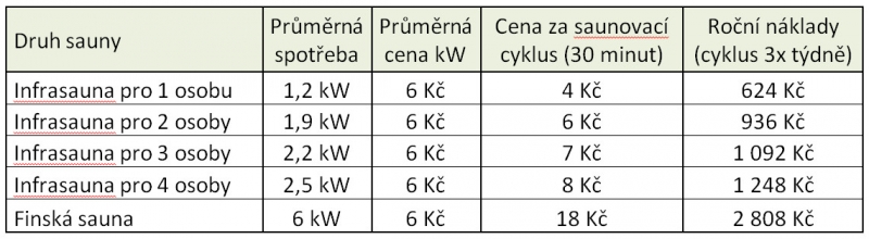 Infrasauny jsou energeticky nenáročné spotřebiče, náklady na energii se pohybují v závislosti na velikosti infrasauny pro každý Váš pobyt v infrasauně okolo 4 - 8 Kč. Záleží na velikosti a kapacitě infrasauny, čím větší infrasauna, tím vyšší výkon potřebuje. Níže naleznete tabulku uvádějící průměrnou spotřebu a přibližnou cenu za saunovací cyklus daného typu infrasauny.