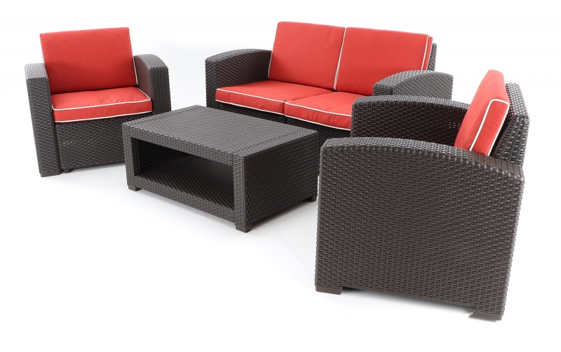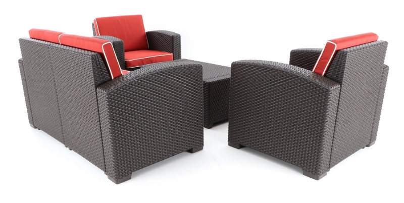 Vysoce odolné účinkům nepříznivých povětrnostních podmínek a UV záření. Barva konstrukce hnědá, polstry jsou červené barvy.