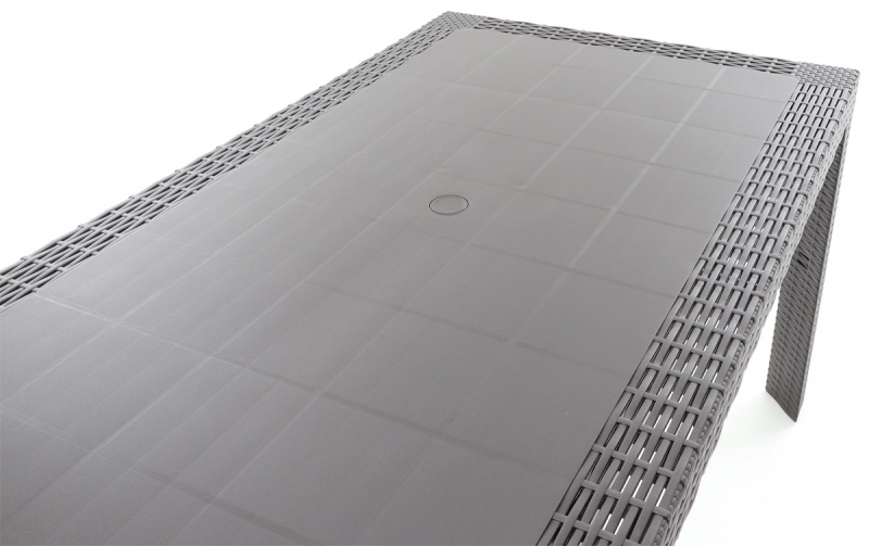 Stůl je ve tvaru obdélníku v imitaci umělého ratanu s UV filtrem.