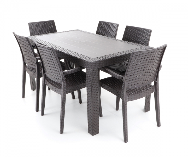 Stolová sestava se skládá z 6-ti pohodlných masivně vyztužených křesel v imitaci umělého ratanu s UV filtrem.
