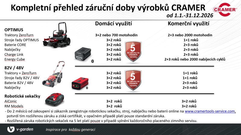 *Do 2 měsíců od zakoupení si zákazník zaregistruje stroj, nabíječku nebo baterii online na www.cramertools-service.coma potvrdí tím rozšířenou záruku a získá certifikát, v opačném případě platí pouze standardní záruka.